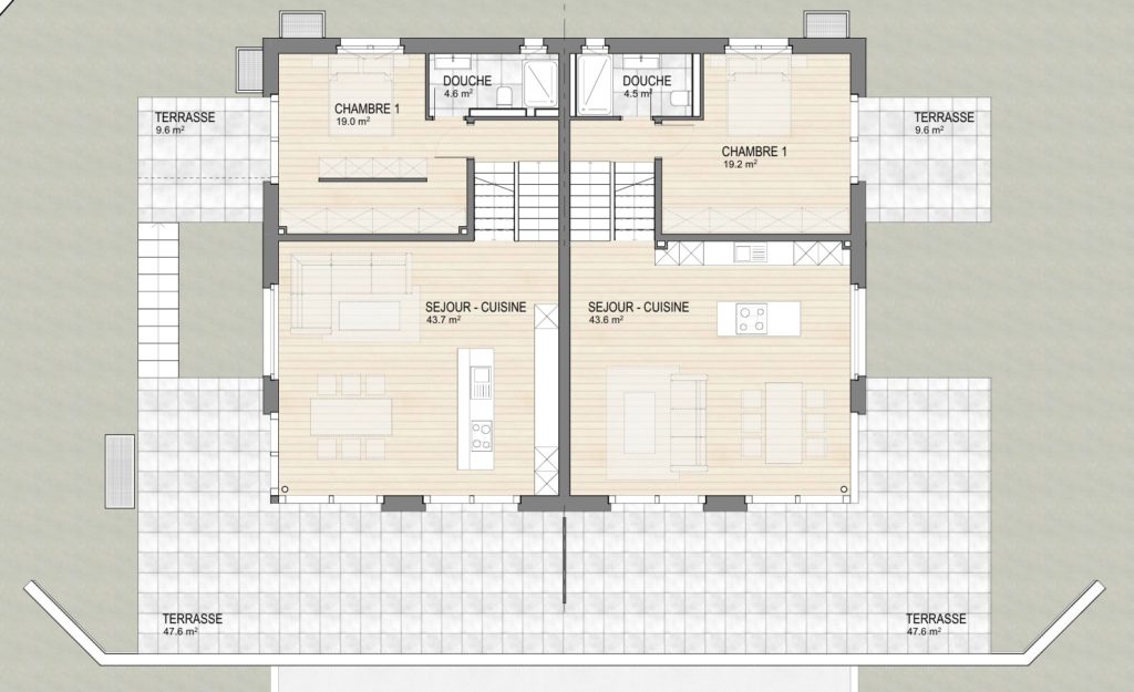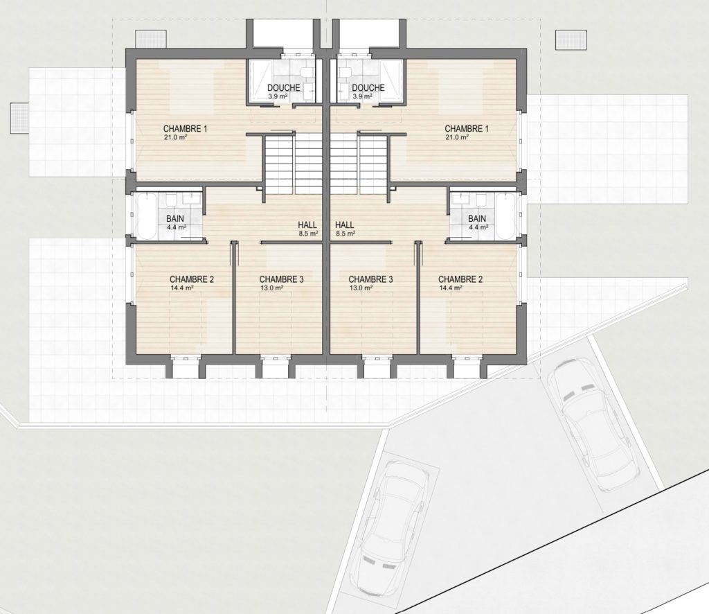 Chaque villa développe une surface utile d’environ 200m2 et dispose d’un sous-sol avec garage et places de parc, alliant fonctionnalité et confort au quotidien. Conçues en demi-étages, elles offrent des volumes bien distincts et généreusement répartis, favorisant une circulation fluide et une grande luminosité.