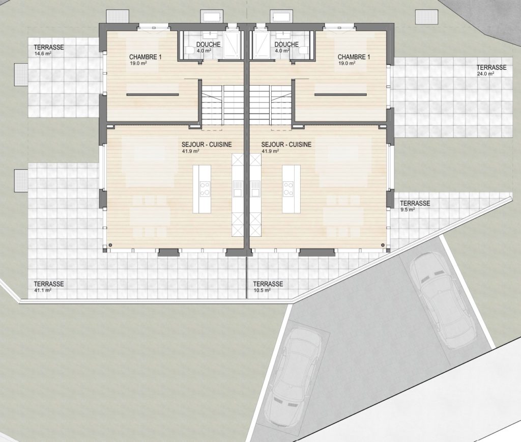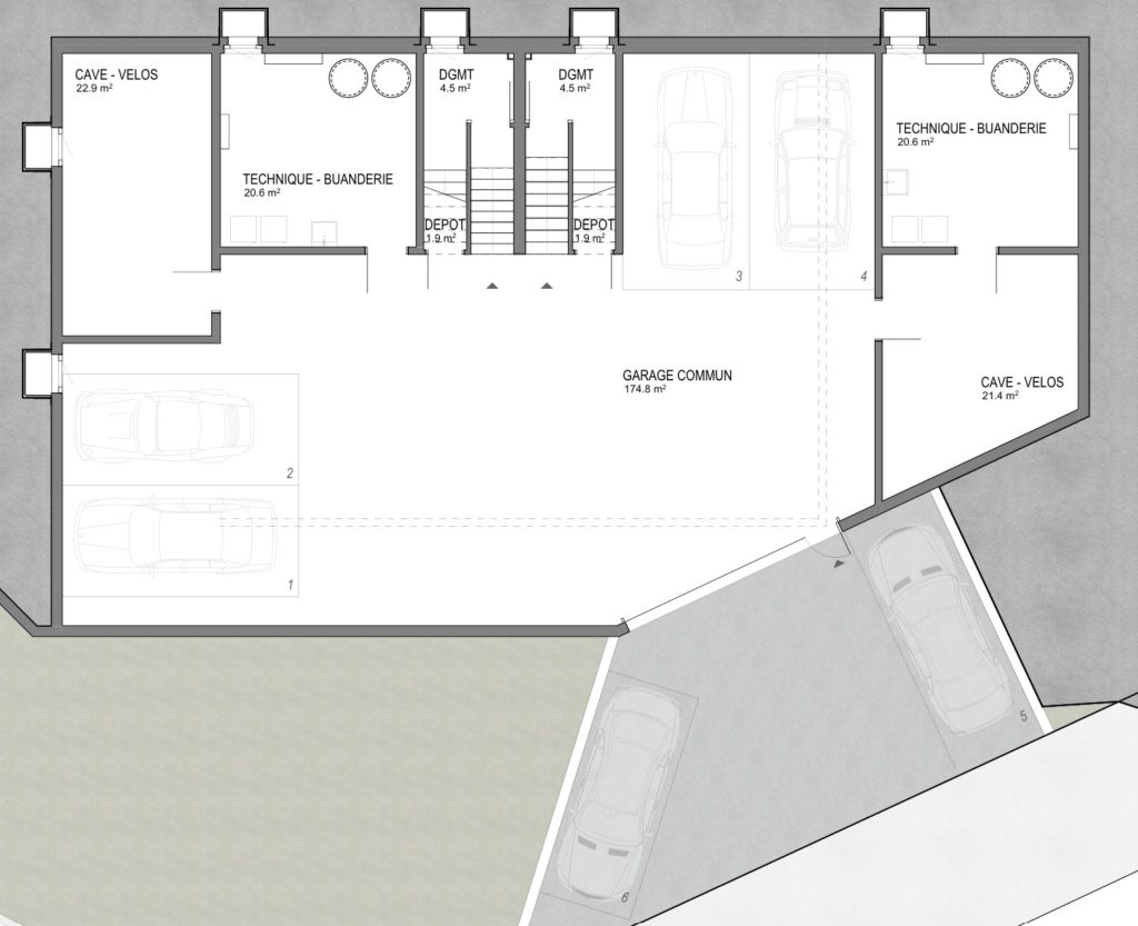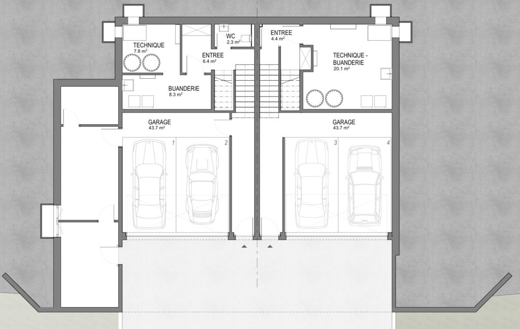 Le sous-sol comprend un garage intérieur pour une voiture, avec la possibilité d’aménager une seconde place intérieur en option ains que des locaux supplémentaires selon vos envies.